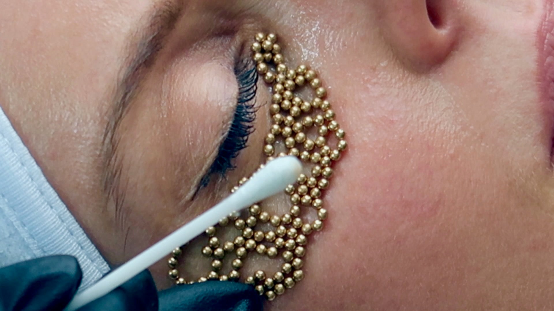 The EYEBAR treatment begins with a gentle under eye nourishing cleanse before a conducting gel is applied to hold the Qi beauty STIMS in position to boost circulating dermal nutrients which move towards the STIMS.